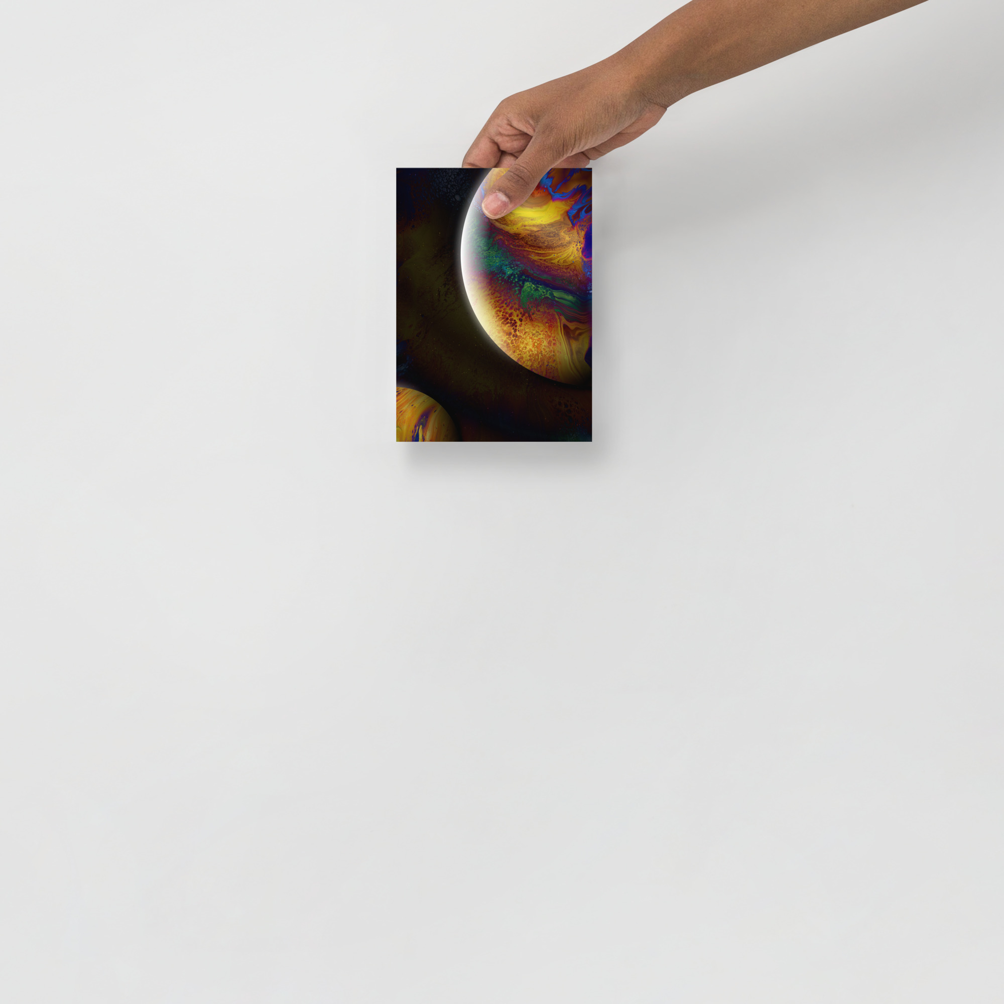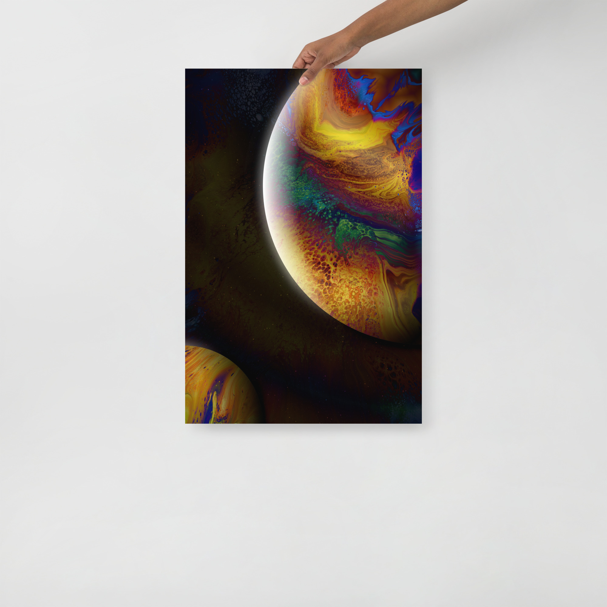 Gold and green and brown and blue, two planets hang in space. Made in 2020.